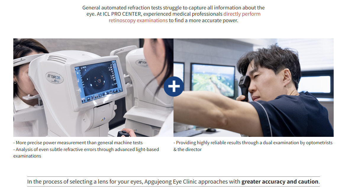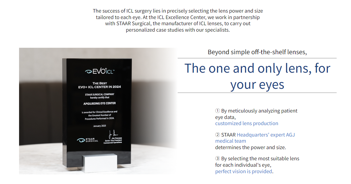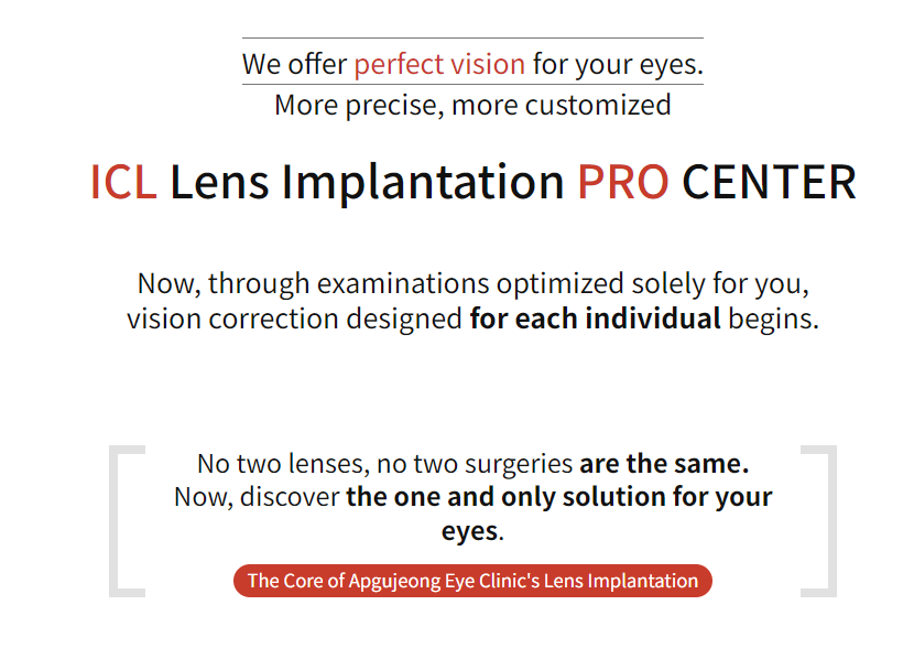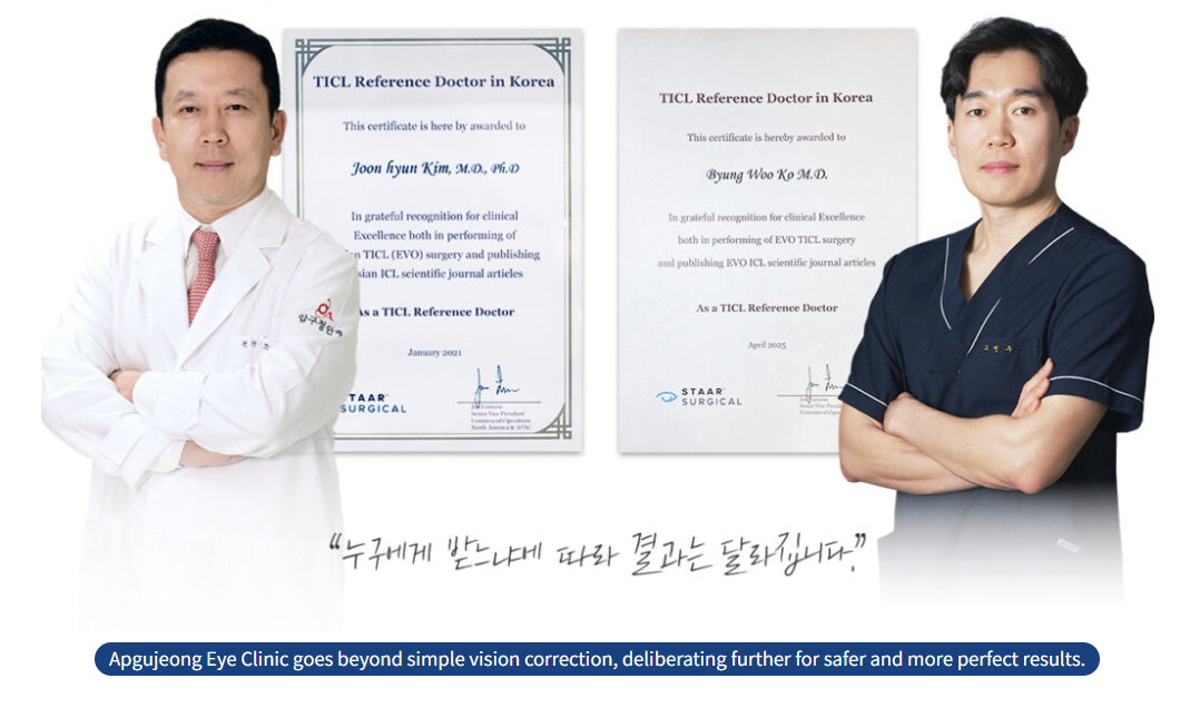 Implantasi kanta ICL memerlukan kemahiran yang halus dan pengalaman yang luas. Ketua pengarah Klinik Mata Apgujeong telah diiktiraf atas kepakaran tinggi mereka dalam bidang implantasi kanta ICL, dan telah memperoleh pensijilan 'Doktor Rujukan ICL'.